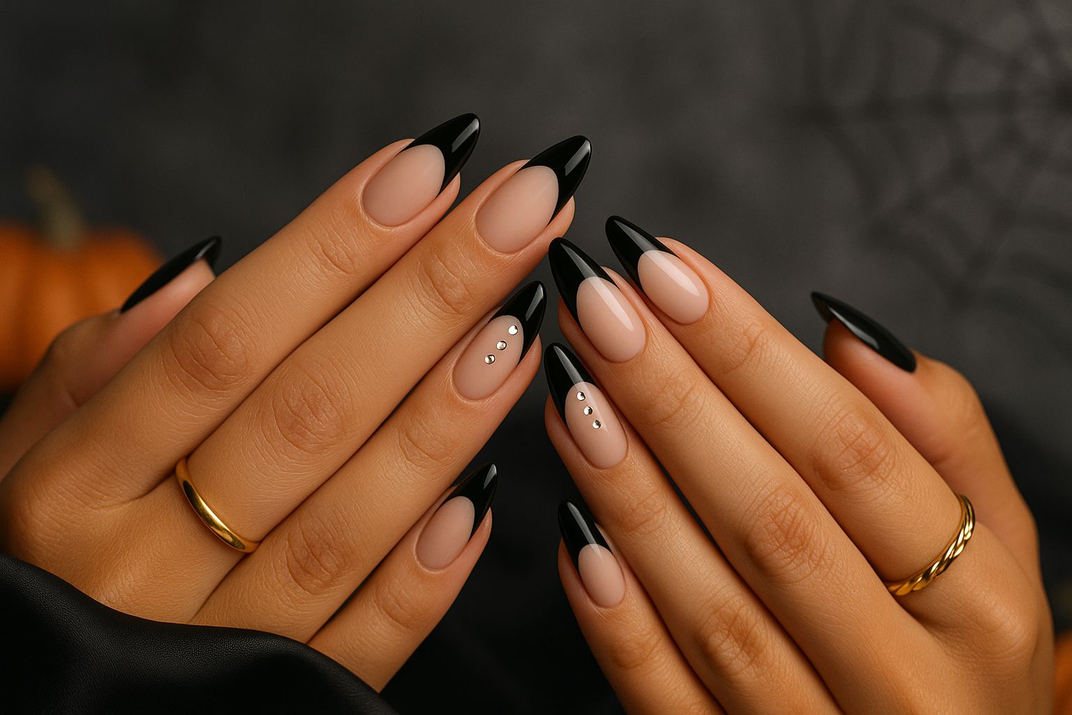Black French, crystal studs—chic Halloween energy, zero costume required.