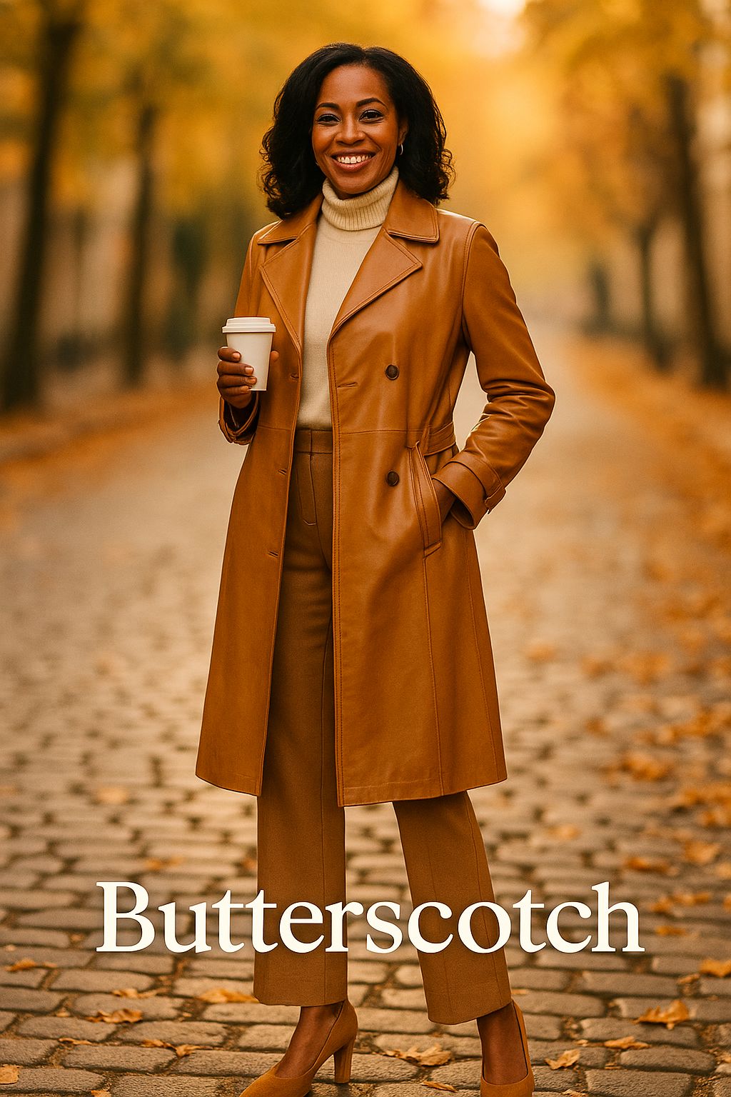 Coat or trench: Camel or Cappuccino, longline, minimal hardware.