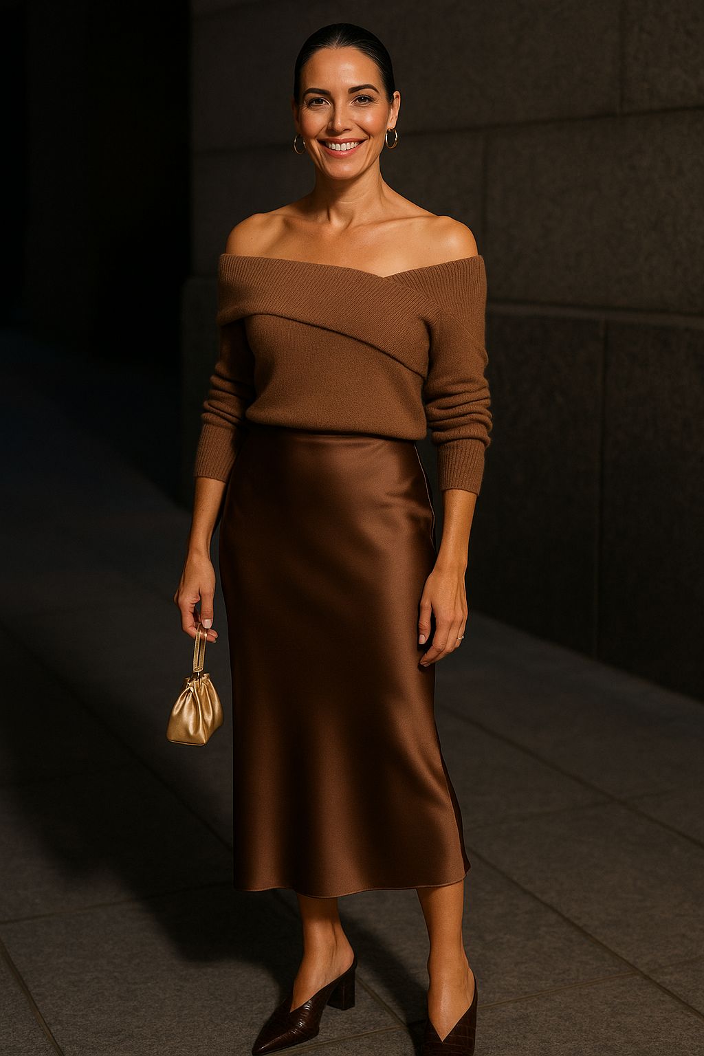 Evening soft power: Iced Coffee satin slip skirt + cappuccino knit + croc-embossed heels.
