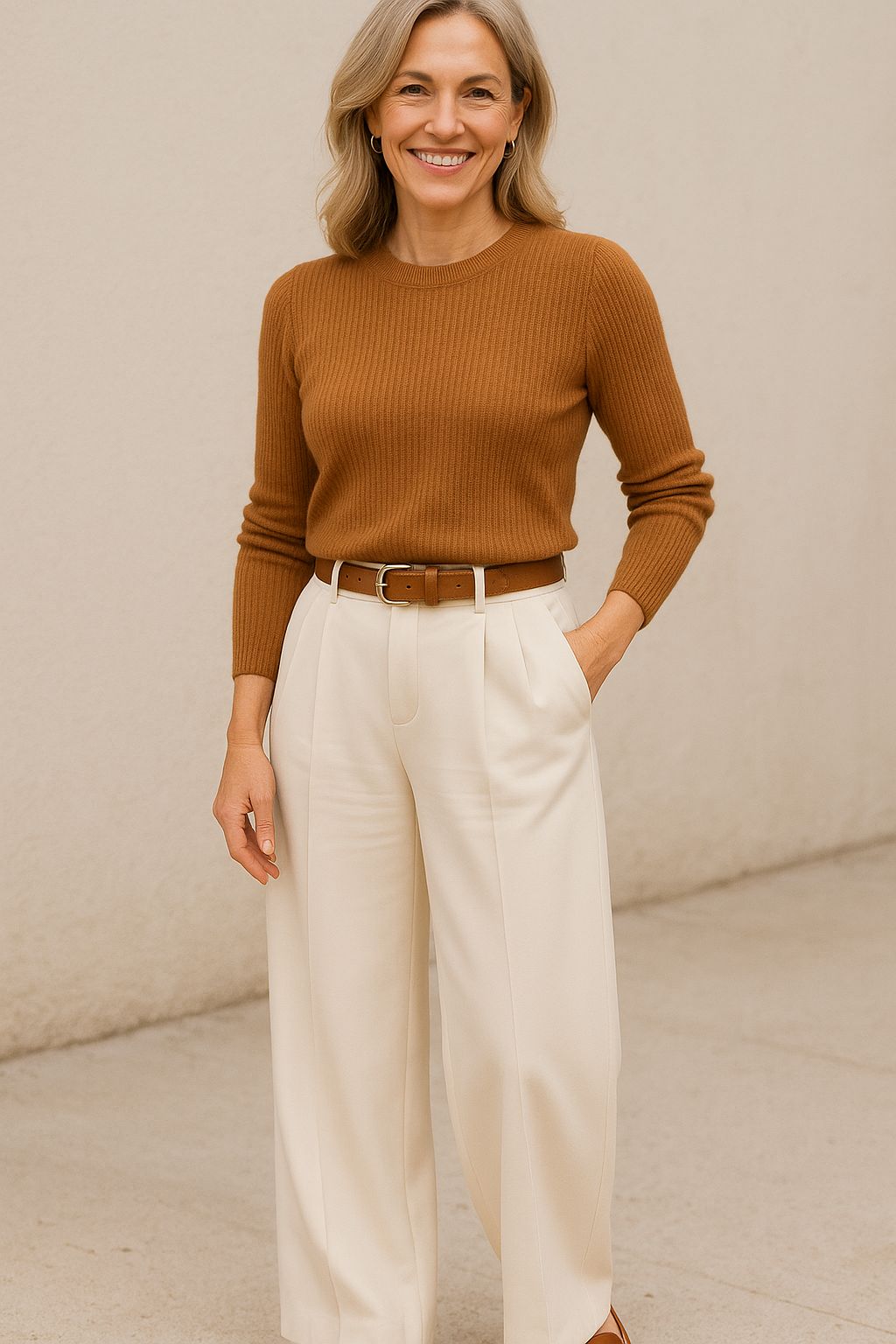 Why it works: You’re sculpting the silhouette with subtle contrast. Keep textures distinct (fine knit, twill, suede belt, brushed wool).